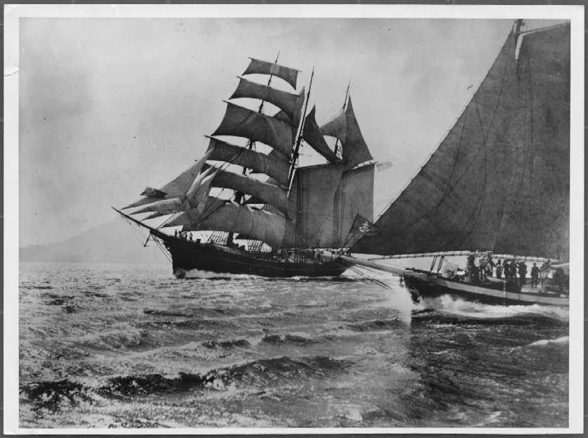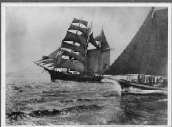 It became a part of the Fourth of July festivities, and San Francisco Bay's reliable summer afternoon wind guaranteed an active race. Thousands of spectators watched from the top of Telegraph Hill where the bay spreads out in a magnificent panorama (above is a photo of Makah flying the Master Mariners jack, July 4th, 1884 - click on photo to enlarge). Some of the fleet was nearly always visible to the spectators. The original races started between Goat Island and the foot of Telegraph Hill, headed towards Hunter's Point, then in a reach off toward the mouth of Oakland Creek. Beating back toward Telegraph Hill, out to the Gate, and ending the race in a pleasant run back. The boats were timed as they left the starting line, and again when finished, so starts could be delayed without penalty. Thirty to forty schooners participated, many guests were invited aboard, spirits were high, and the bottle was passed around from one to another as they fought to win the race.